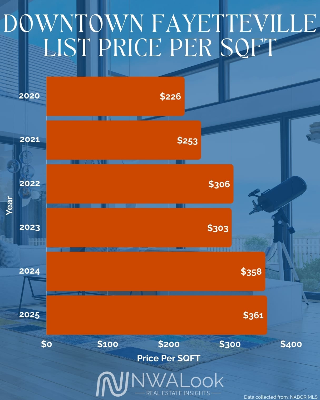 From 2020 to 2025, home values in the downtown Fayetteville core have surged. The median sale price climbed from $310,000 in 2020 to $570,000 in 2025, an 84% increase in just five years. Price per square foot followed a similar pattern, rising from $226 in 2020 to $361 in 2025.