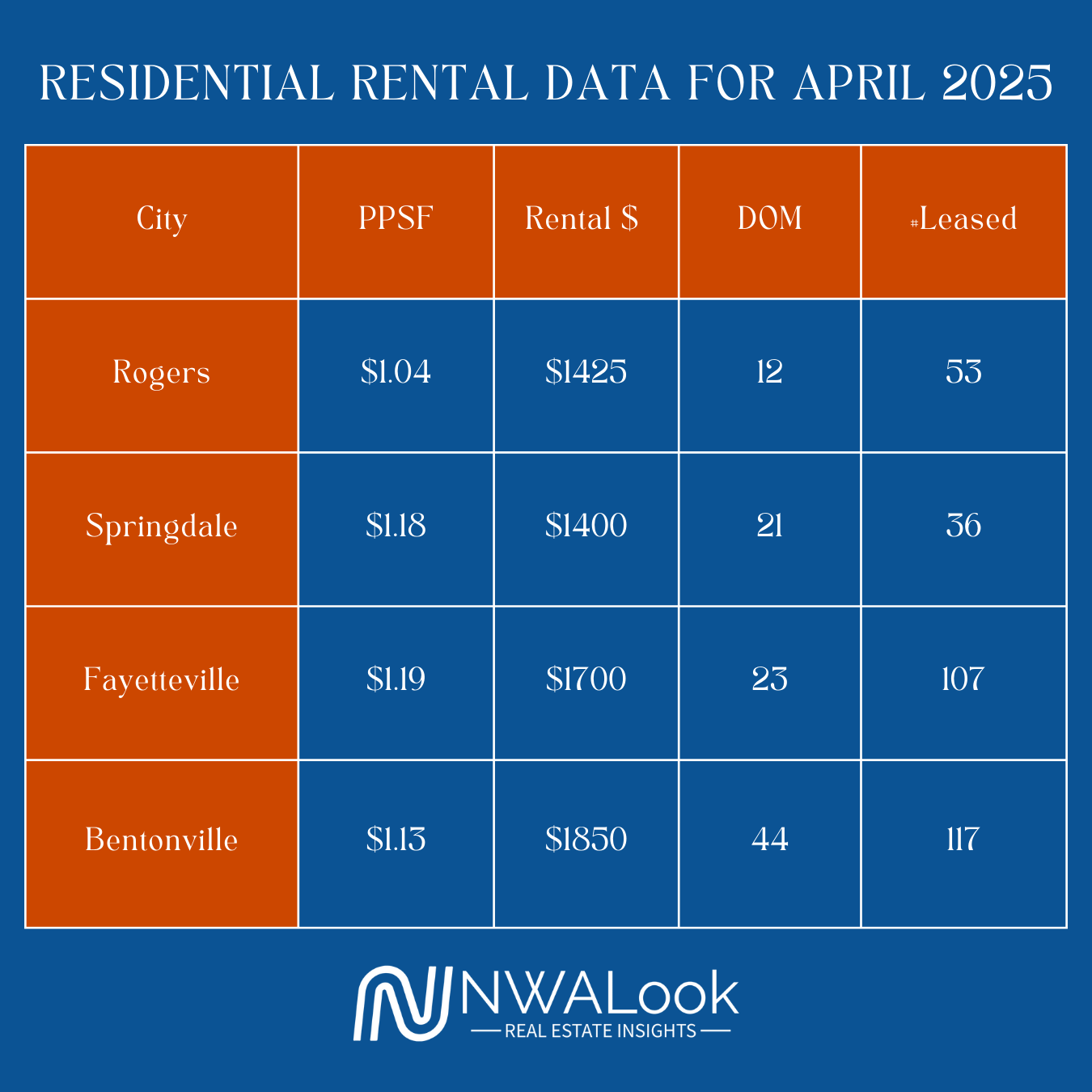 Data Collected from Northwest Arkansas Board of Realtors, Residential Rentals Month of April 2024 & April 2025.
