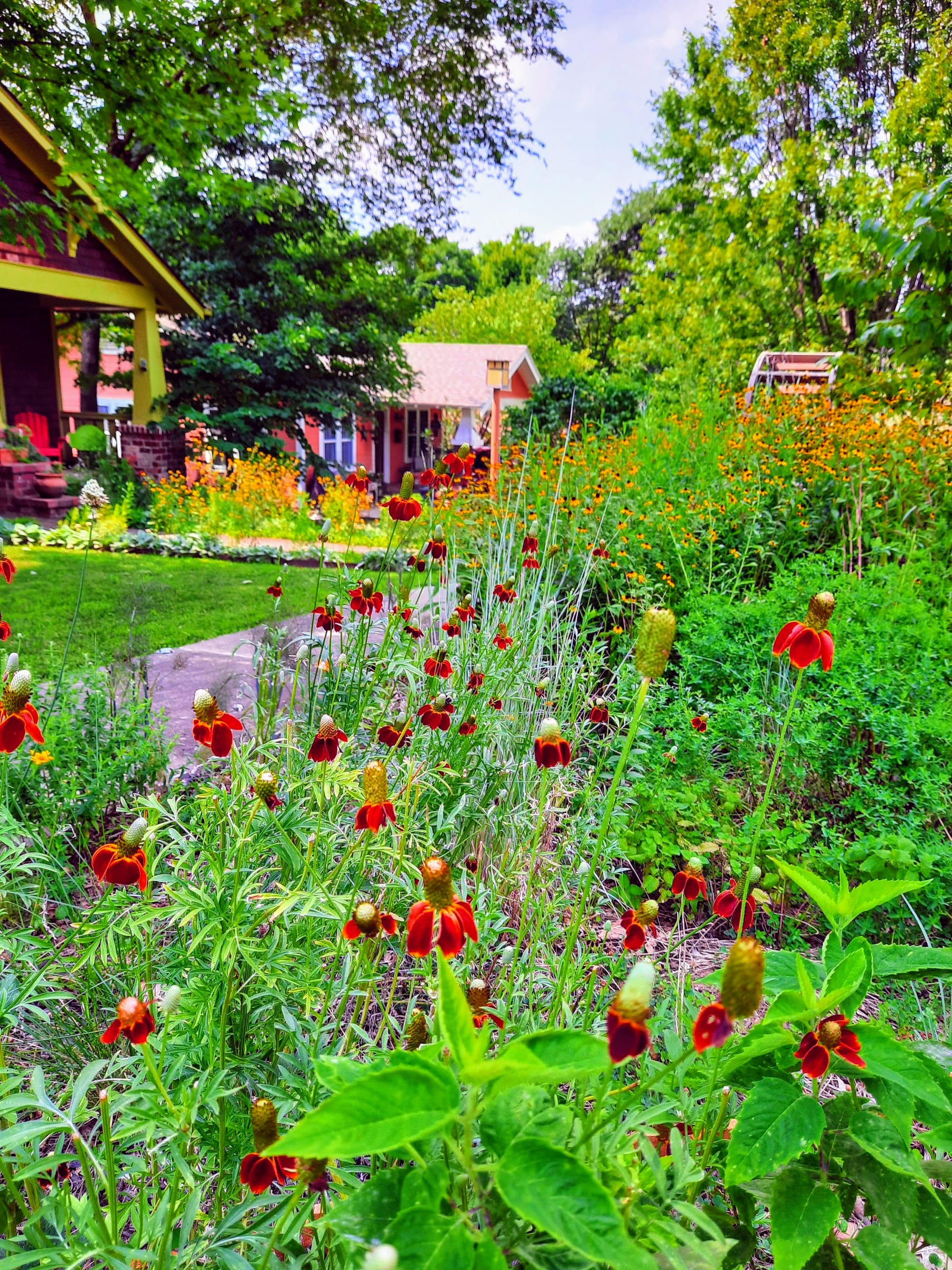 Long term, having a mostly perennial garden will be easiest on the workload and the wallet. But when your garden is young and the perennial plants have not filled out the space yet, consider seeding with both native and non-native annual flowers. This is a very cost effective way to instantly add color. And you’ll be rewarded with lots of bees and butterflies in search of food. Seeds can be bought online or at big box home improvement stores. Some good options for Spring color are non-native bachelor buttons, alyssum, and crimson clover. Zinnias, marigolds, and cosmos do really well from summer until frost, as do native annuals like partridge pea and lemon bee balm. Just scatter the Spring bloomers in March-April, and the summer bloomers in May, and let nature do the rest.